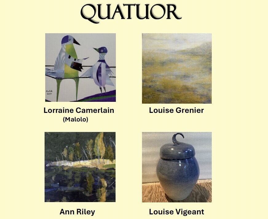 Quatuor Du 18 au 23novembre Lorraine Camerlain ( Peinture & Collage) Louise Vigeant ( Poterie) Ann Riley ( Peinture) Louise Grenier Horaire Mardi au Dimanche 12h-19h […]- Date